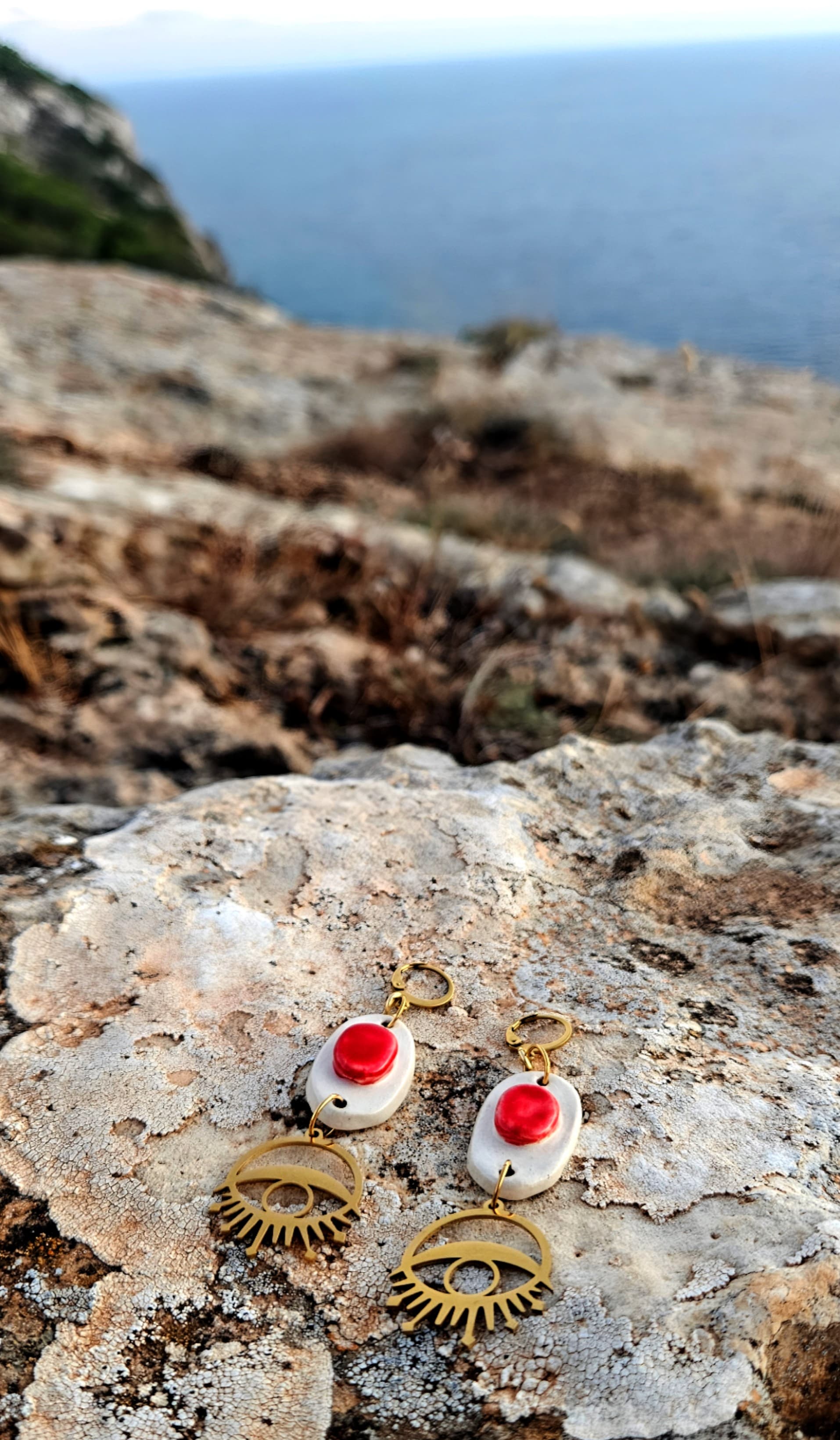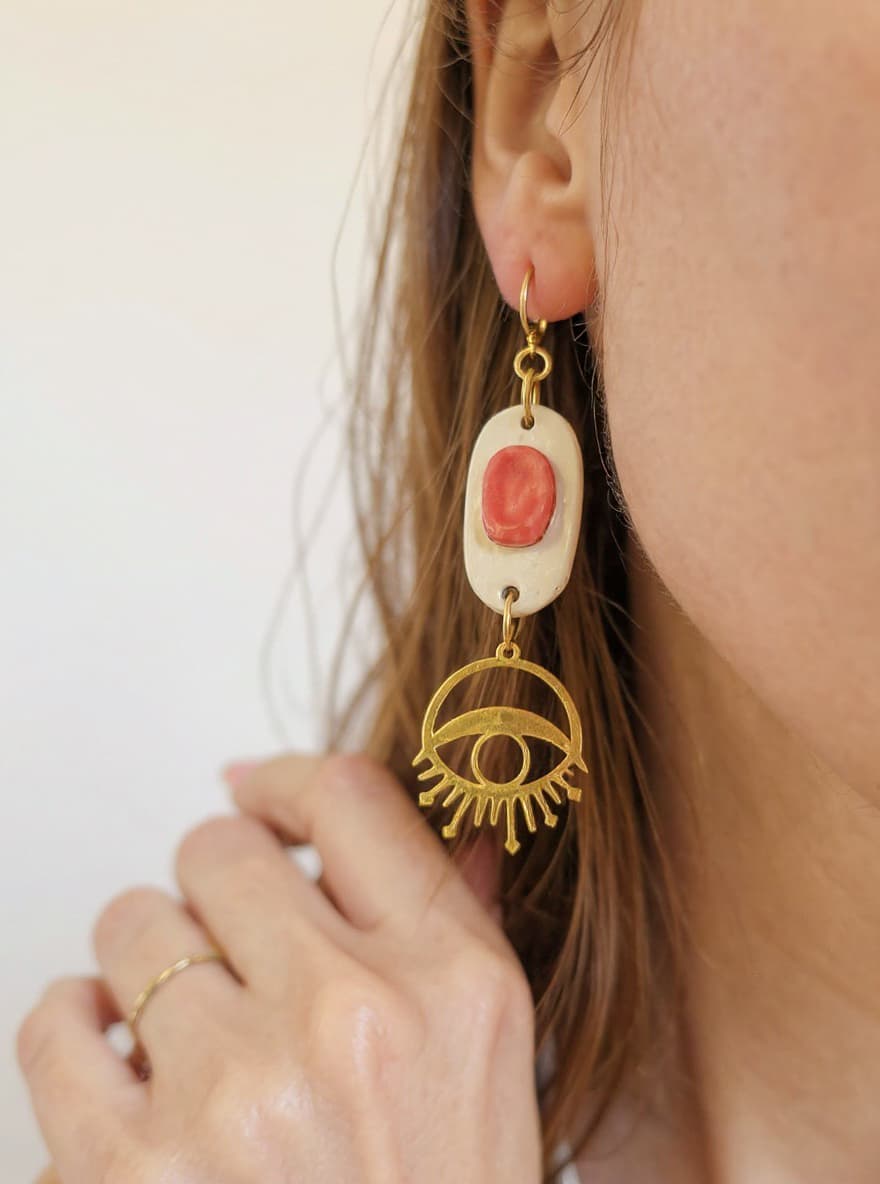 ❤️👁 Pendientes con pieza de cerámica moldeada y esmaltada a mano con materiales libres de cadmio, plomo y níquel. Esta acompañado con un ojo dorado de acero inoxidable. El cierre es de acero hipoalergénico (316L), resistente y amable con tu piel.